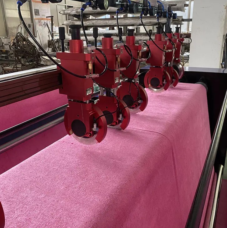 Prije ispitivanja prednosti, korisno je jasno razumjeti princip rada. U konfiguraciji prorezivanja tipa smicanja, parovi kružnih gornjih i donjih noževa postavljeni su duž širine putanje mreže. Gornja oštrica preklapa donju oštricu kontroliranom količinom - obično 0,5 do 2,0 mm — a dvije suprotno rotirajuće oštrice primjenjuju silu smicanja na tkaninu dok ona prolazi između njih, režući je na isti mehanički način kao što škare režu papir. Oznaka "zračni rezač" odnosi se na sustav pneumatskog pokretanja: cilindri sa komprimiranim zrakom zahvaćaju i isključuju držače oštrica, postavljajući oštrice s preciznošću i primjenjujući dosljednu bočnu silu koja se može kontrolirati kako bi se održao ispravan kontakt između oštrica tijekom cijelog rezanja.